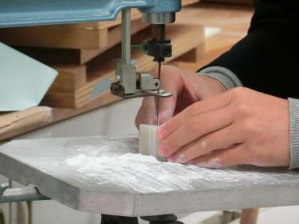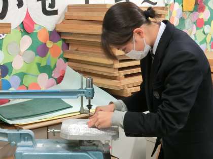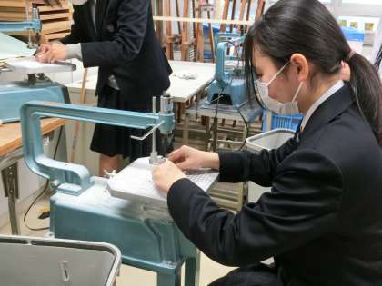 電動ノコギリも駆使して形にしていきます。結構白い粉が出て制服が白くなりますが、みな夢中でした(菅野)