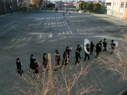 昨日の放課後、部活をやっている校庭から音楽が聞こえてきました。毎年出ているボロ市のマーチング演奏に向けての練習です。寒い中の演奏は、手先が動きずらくかつ足も合わせなければならず、苦労が多いことと思います。地元からの期待に応える桜木中学校ならではの姿です(菅野)