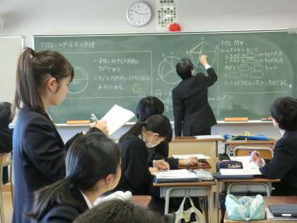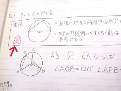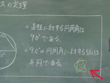 黒板の定理の解説のところに何やら見かけぬマーク(赤い矢印の示すところ)が描かれていました。「重要くん」というキャラクターだそうで、先生が若いころに考案されたとのこと。全部で4種類あり、これは標準的な重要くんだそうです。きちんとノートに描いている生徒もいました(菅野)