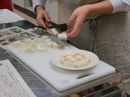 和食の基本食材であるお豆腐ですが、柔らかいだけに扱いが難しい。これを食べる人の前まで形を崩さないで提供できたら一人前といえるでしょう(菅野)