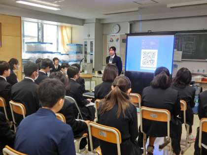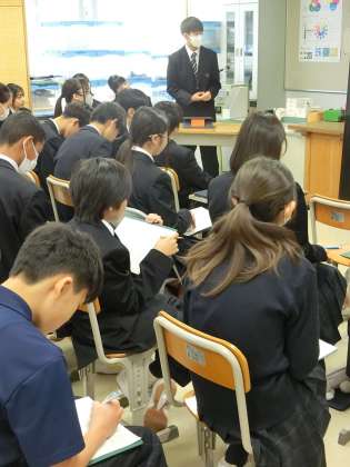 始まる前の呼びかけから司会、最後のまとめまで2年生の生徒が運営しているところも見事です。先輩の立派な姿に、聞いている1年生もメモや感想をしっかり書いていました(菅野)