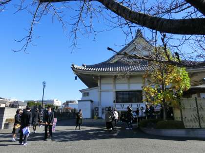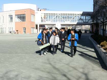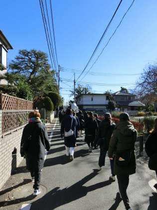 毎年この時期に開催されるボロ市で、パレードを行うために参加する桜木中吹奏楽部が校庭に集まり、待機場所である円光院に向かいます(菅野)