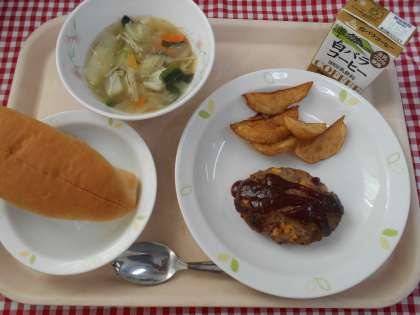 ☆献立 セルフジャムパン コーヒー牛乳 ハンバーグ フライドポテト 野菜のスープ