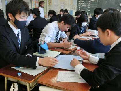 3年 理科 公開日 2024/12/19 更新日 2024/12/19 今日のできごと 3年理科はメンデルの法則を学んでいます。めしべとおしべに見立てた緑と黄のビーズを入れたフィルムケースをサイコロのように振り、出た色を記録していきます(菅野) いいね(0)