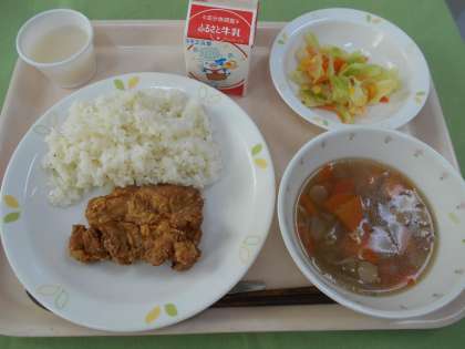 12月24日(火)今日の給食 クリスマス給食 公開日 2024/12/24 更新日 2024/12/24 給食 ☆献立 ガーリックライス 牛乳 鶏肉のから揚げ コーン入りキャベツサラダ ABCスープ ホワイトゼリー いいね(0) 給食
