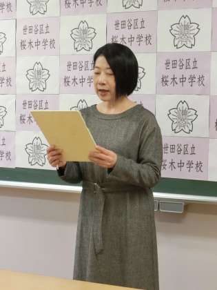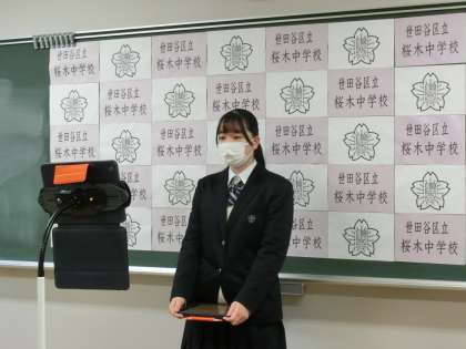 2学期の終業式は学級閉鎖のクラスのことも考慮し、動画配信で行いました。代表生徒は原稿を見ず、画面の向こうにいる生徒たちの方をみて語りかけていました。最後に校長先生からのお話を副校長先生が代読をしましたが、その中で、三年生の面接練習で感じた桜木中生の前向きな考え方、姿勢をうれしく思う校長先生の気持ちが伝わってきました(菅野)