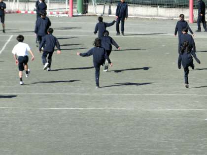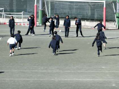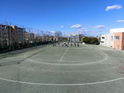 最低気温2度を観測した今朝の世田谷。西寄りの寒風が吹きすさぶ中、元気に校庭で体育の授業に励む1年生です(菅野)