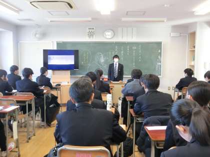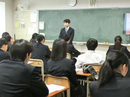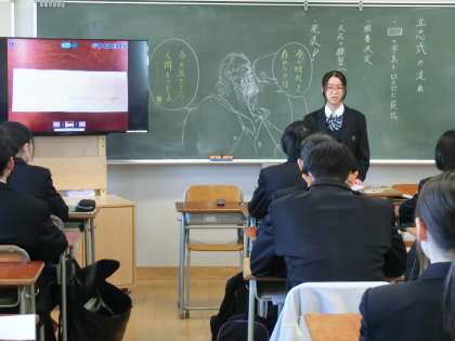 2年生のキャリア教育の時間に行われた立志式。3年生の進路選択に臨む前に、志(こころざし)をたて、将来に展望を持った生き方を考えるきっかけになる機会になれば、という思いで始まった時間のようです。自分が立てた志のカードをモニターに写して発表しています(菅野)