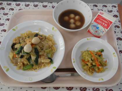*献立 五目あんかけそば 牛乳 野菜のごまだれかけ 白玉しるこ☆