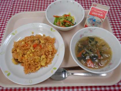 ☆献立 チキンライス 牛乳 白菜の野菜スープ カレードレッシングサラダ