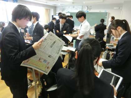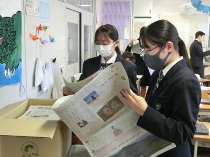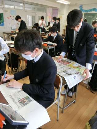 3年生の国語の授業では新聞スクラップに取り組んでいます。桜木中では、廊下の閲覧台に当日の新聞が置いてあるだけでなく、過去の新聞も段ボールからいつでも取り出して読めるようにしてあります。これを活用しない手はありません(菅野)