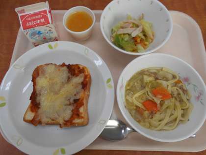 ☆献立 ピザトースト 牛乳 ヌードルスープ コーンサラダ ピーチゼリー
