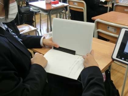 90度に開く? 公開日 2025/01/27 更新日 2025/01/27 今日のできごと 本を90度に開くにはどうすればいいか?との課題に取り組んでいる1年生。定規を縦に置く、横にする、分度器を使う…などなど。頭をフルに回転させています(菅野) いいね(0)