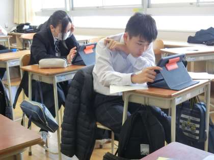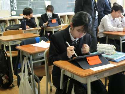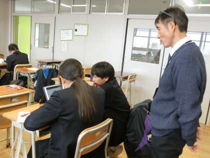 校長先生も興味津々で生徒のキュビナ学習を見守っていました(菅野)
