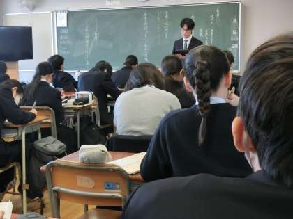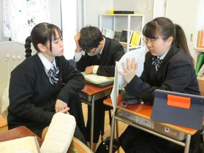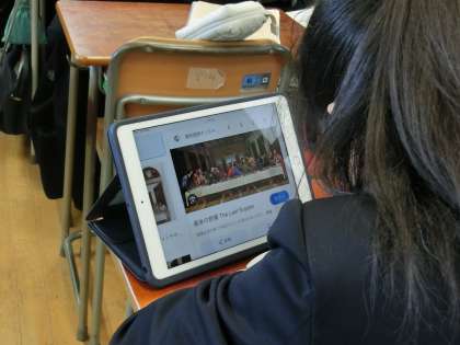 かなり複雑で難解な内容ですが、しっかりついてくる生徒たち。さすがです。理解の助けになるであろう『最後の晩餐』をタブレットで確認している生徒もいます(菅野)