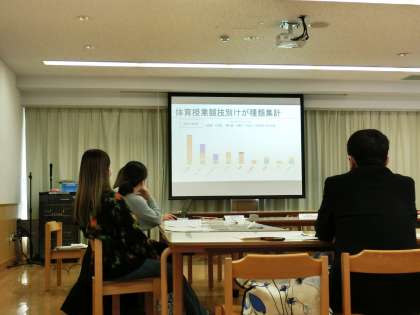 午後はランチルームで学校保健委員会が行われました。年1回、保健室への生徒の来室状況や学校保健に関する資料を地域の方や保護者に説明する会です。撮影した時は、ちょうど体育の時間のケガの状況について解説をしているところでした。マット運動では、筋力の低下から自分の体重を支えられない生徒が多いことに保護者からため息がもれていました(菅野)