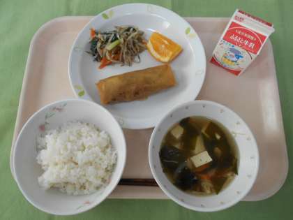 ☆献立 麦ごはん 牛乳 春巻き 塩ナムル 和風わかめスープ いよかん