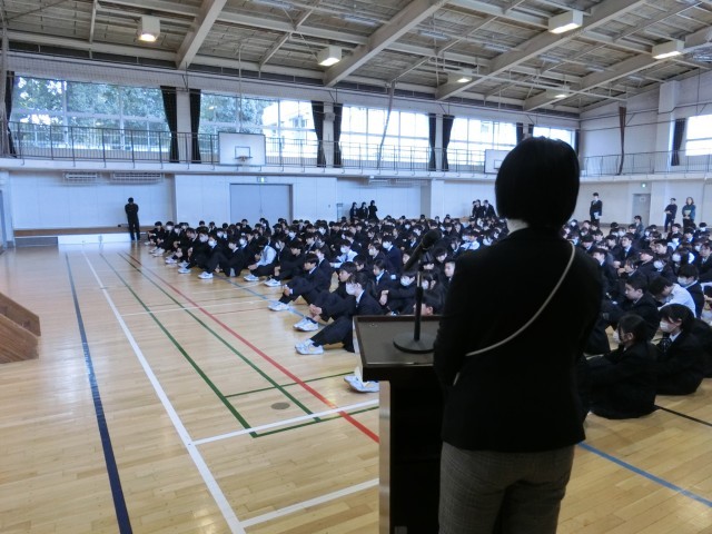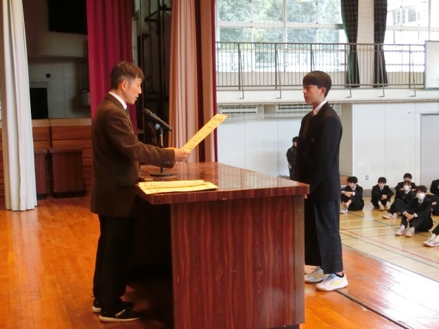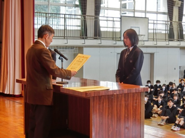 今年度最後の全校朝会では陸上競技部の表彰も行われました(菅野)