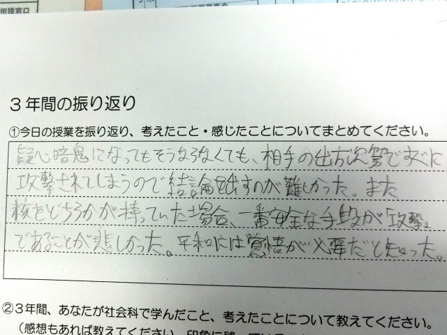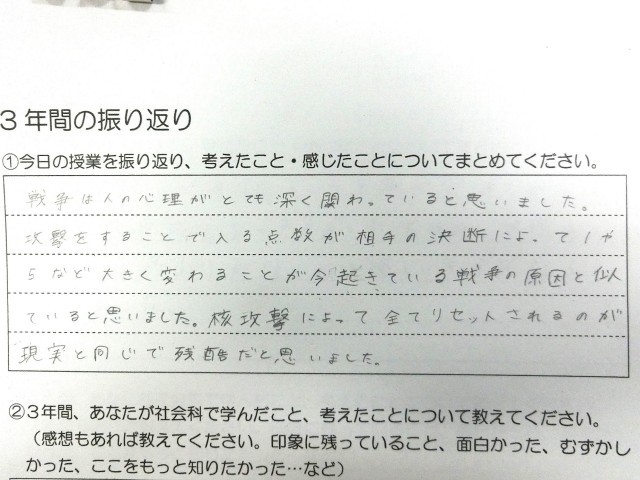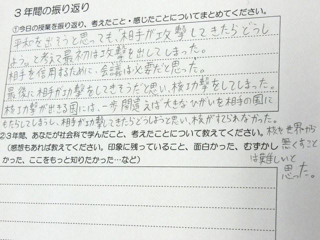 3年間の成果です 公開日 2025/03/06 更新日 2025/03/06 今日のできごと 授業の最後に振り返りを書いてもらいましたが、みな5分以内にササっと考えをまとめていました。3年間を通じて学んできた「考える社会科」の成果が表れているようですね(菅野) いいね(2)