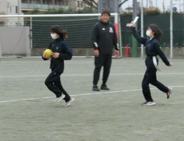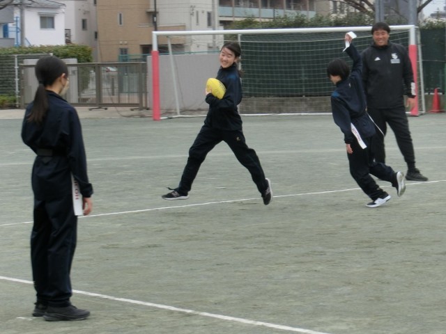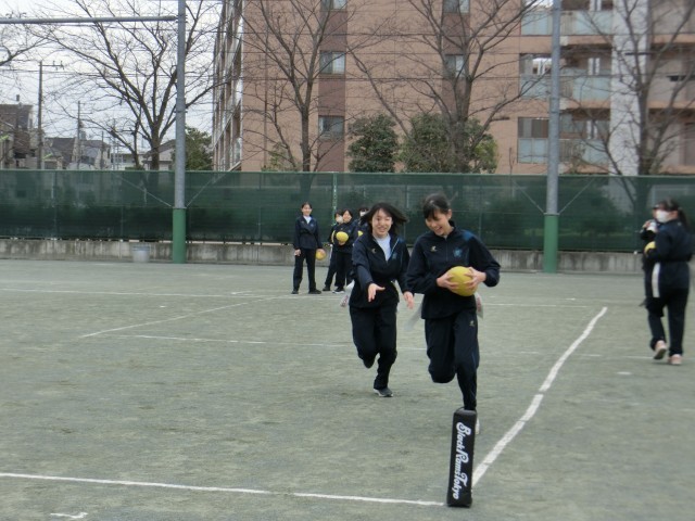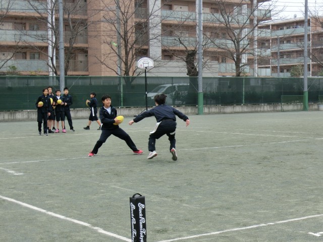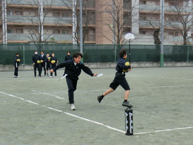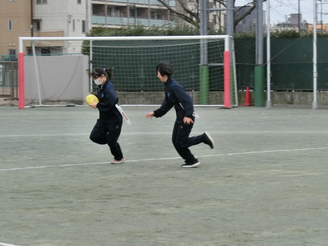 1対1で試合が始まりました。ルールがシンプルなので運動が苦手な生徒でも楽しめそうです。+3をタップすると腰のタグを取って勝利!した瞬間が…(菅野)