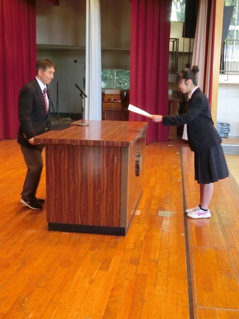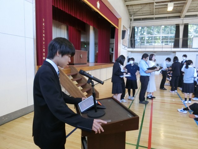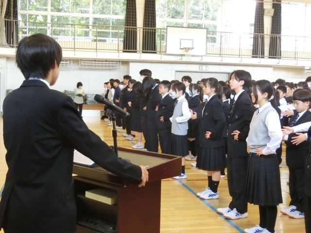 今朝の生徒会朝会の様子です。生徒会が自主的に運営する朝会ですが、少人数ながら見事な運営でいつも感心させられます(菅野)