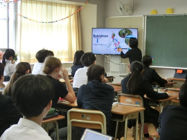 今日の3年生、英語の授業です。今年度から担当するALTの先生が自己紹介を兼ねて授業をしています。実はこの中にアメリカのオレゴン州から来た生徒がいます。ことしも桜木中学校に体験入学したマウントテーバー中学校の生徒です。昨日は華道体験も行い、廊下には作品も展示してありました(菅野)