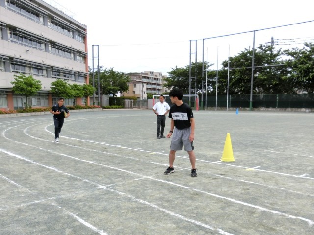 全員リレーが終わった後、体育科の先生が『見ていて危ない』と思った点を実演で示しています。自分のクラスの人が第2コースで待っているのを確認してバトンを渡そうとした瞬間、受け取る側が「あっ、少しでも有利になるように内側に入らなきゃ」と咄嗟に第1コースに移ると、バトンを渡す側の人がバランスを崩して転倒することがあります、という例を示しています。分かりますか?(菅野)