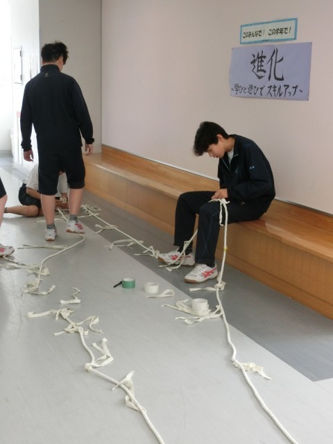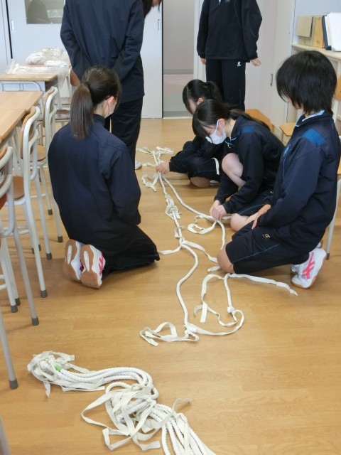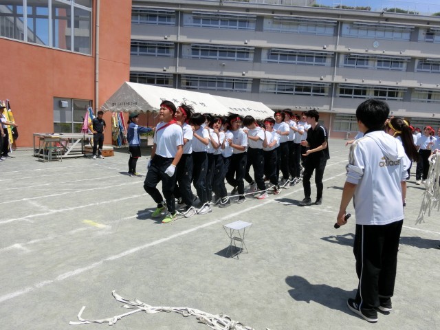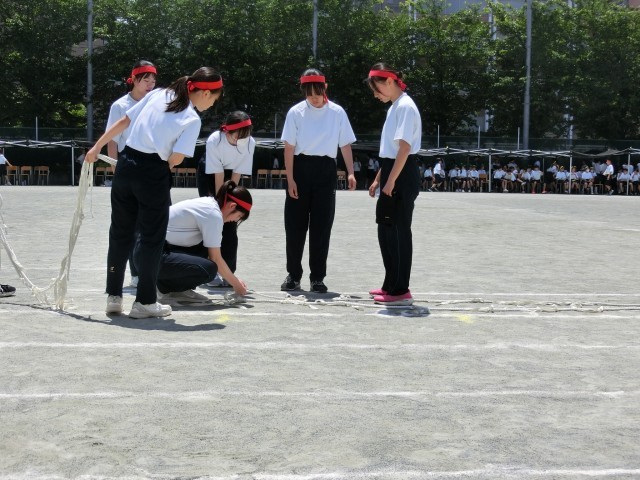 先日の予行では、学年種目で学年全体がひとつになる姿を下級生に示してくれた3年生。実は、当日の早朝から教室や廊下で、足を結ぶひもを調整修復する姿がありました。足を保護するため、ある程度の力がかかると切れやすい材料を使っていることもあり、そのメンテナンスには時間と手間がかかります。体育大会当日の進行が遅れないよう配慮をする。そんな気配りができる生徒たちだからこそ、全員が一つになれる気持ちを持つことができるのですね(菅野)
