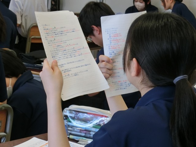 最終確認 公開日 2025/06/18 更新日 2025/06/18 今日のできごと 1時間目は国語の定期考査です。教室では直前まで最終確認に集中する3年生の姿がありました。努力の結晶である教科書やノートにはびっしりとマーカーが引かれ、細かくメモが書き込まれていました(菅野) +1 いいね(3) 授業 3年