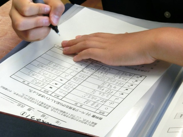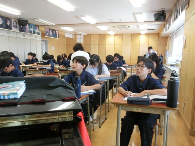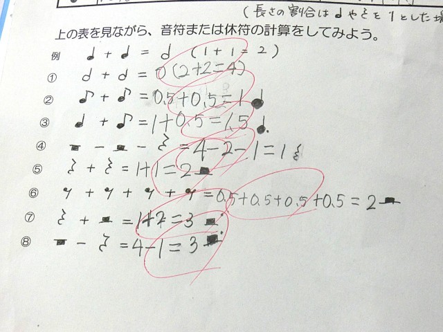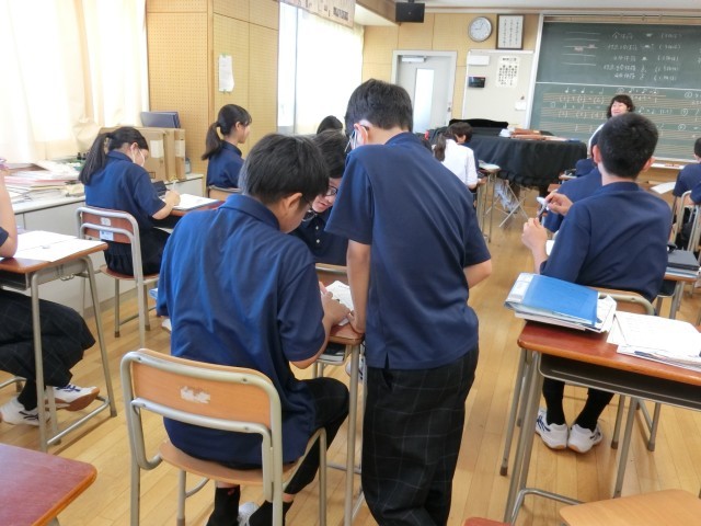「音楽を聴いたり、歌うのは好きだけど音符が出てくるとちょっと…」と苦手意識を持つ中学生は多いはず。それでも桜木中1年生は熱心に黒板の音符や給付を写し、‘計算問’’を解きながら興味を持って学んでいます。友だち同士で教え合い苦手意識を克服しています(菅野)