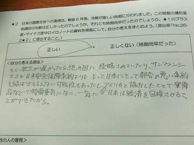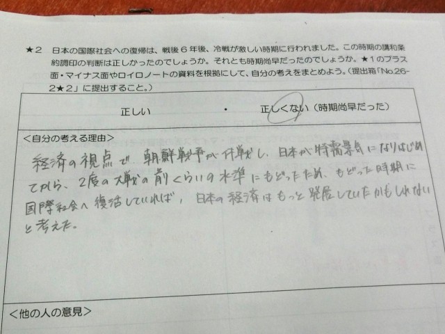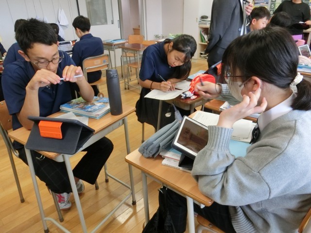 この問いかけに、自分の考えを理由をつけて書くことができるのは、やはり日頃の学習の成果です。つねに「なぜ」「どうして」「何を根拠にそう考えたか」を自分自身に問いかけることをしていくことの大切さ。そしてそれを人に伝える努力をする。桜木中では皆、授業中は常に“考える人”になっています(菅野)