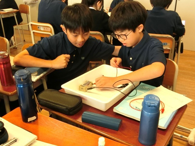“発展問題” 公開日 2025/07/04 更新日 2025/07/04 今日のできごと “発展問題”として自分のシャープペンシルに電流を流してみる生徒もいます。そうすると次々に『これはどうだろうか』と実験をしたくるものです。『果たしてこの焼きそばは…』(ちなみにこの容器は何かのおまけとして付いてきたもので本物ではないそうです。実によくできています!)など実験意欲がわいてきます。豆電球が光った時のうれしそうな表情が充実感を表していますね(菅野) いいね(1) 授業 1年