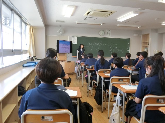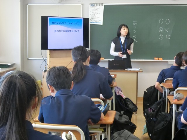 カウンセラーの先生が「相手やグループが1つになるためにコミュニケーションをとるのではなく、相手と自分はどう違うかを発見し、歩み寄るためのもの」と話された内容がとても印象的でした。『待ち合わせに15分遅れてきた相手になんと声掛けをするか』という問い。「いいよ、いいよ。大丈夫」本当に大切にしたい相手に対し、これでいいのでしょうか…。カウンセラーの先生の言葉に、生徒たちは改めて真のコミュニケーションの意味を考え始めているようでした(菅野)