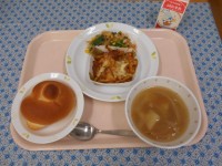 ☆献立ミルクパン牛乳ラザニア春雨と青菜のソテー野菜スープ