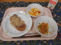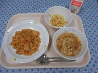 ☆献立チキンライス牛乳じゃがいものハニーサラダ卵とトマトのスープ