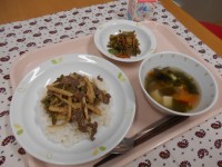 ☆献立豚すき丼牛乳ワンタンスープみかん