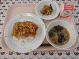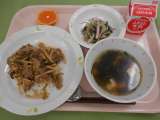 ☆献立 チンジャオロース丼 和風サラダ わかめスープ 菊花みかん 牛乳