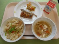 ☆献立たけのこのごはん牛乳ししゃものからあげちくわの天ぷら白菜のおかかかけ豆腐汁