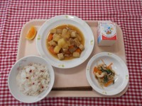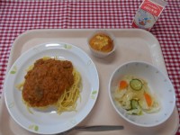 ☆献立スパゲティミートソース牛乳ポテト入りフレンチサラダママレード菓子