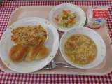 ☆献立 あしたばパン チキンとトマトのグラタン グリーンサラダ 卵スープ 牛乳