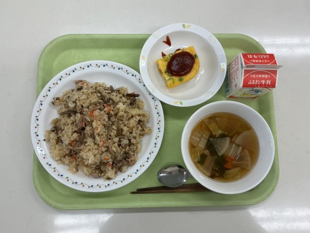 今日の給食🍚・ご飯・福袋煮・野菜の海苔あえ・呉汁油揚げの中に肉や野菜を入れて煮る福袋煮には、全部で6種類具材が入っています!さて、何が入っているでしょうか!!ぜひ当ててみてください🥚