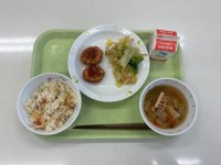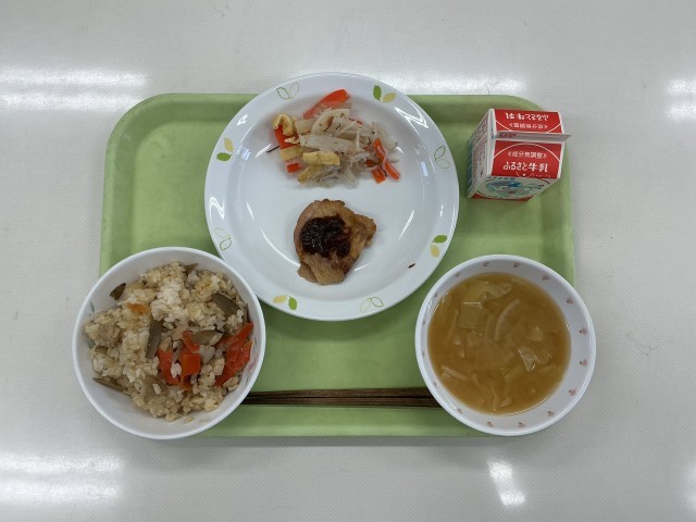 今日の給食🍗・しょいめし・とり焼肉・ちゃつ・野菜のみそ汁🥬本日の給食は、三重県の郷土料理でした!「しょいめし」は、しょうゆを「しょい」と呼ぶ三重県の醤油ご飯です!