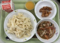 13日献立スパゲティーミートソースコーンとわかめのサラダさっくりドーナッツドーナッツは一つ一つ手作りです。時間をかけて作られています。今日は「揚げ」ドーナツから「焼き」ドーナツに変更になりました。