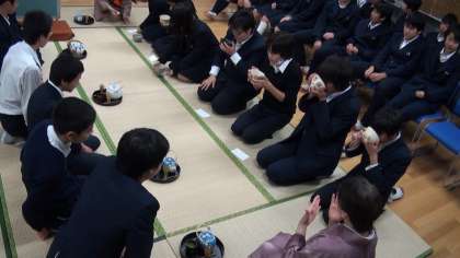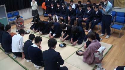 11月30日(金) 3学年「茶道」体験授業。「茶道」を通して、日本文化への興味・関心を深めました。茶道の先生の御点前を見せていただき、各自お互いにお茶を点てて振る舞い、お茶を頂きました。日本文化の豊かさに触れるひとときでした。