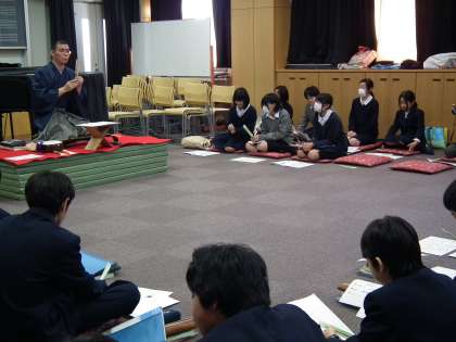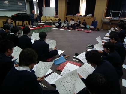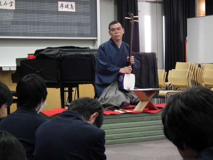 12月10日(月) 2年音楽『長唄』授業。2年生の音楽では、長唄の御師匠様をお迎えして、「勧進帳」の一節を体験しました。その中で、扇子の持つ意味や、扇子の所作の男女の違いなど、初めて知ることもありました。日本文化の一端を垣間見たひとときでした。
