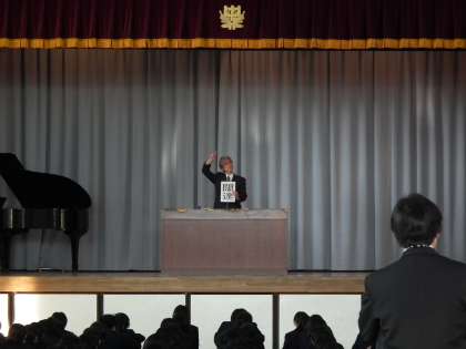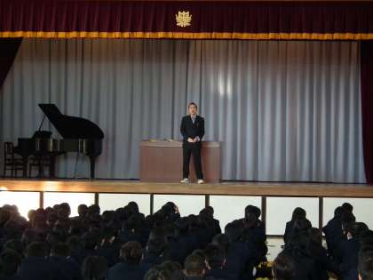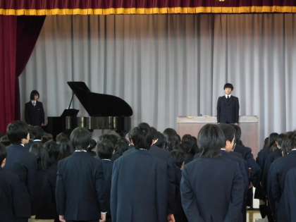 12月25日火曜日 2学期終業式。校長より、文武両道・自主自立・自由闊達のお話がありました。校歌のあと、冬休みの生活の注意がありました。