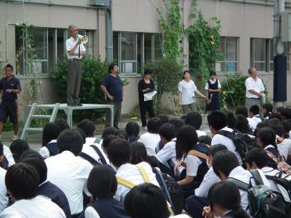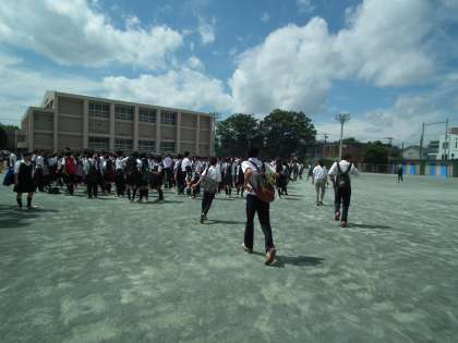 9月2日(月) 集団下校訓練がありました。なぜ集団下校訓練をするのか、校長よりお話がありました。「緊急事態において、中学生が地域のためにできることは何でしょう。」校庭に避難した後、地域別に分かれて、集団下校をしました。