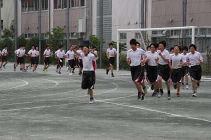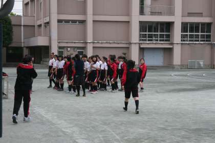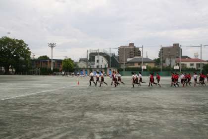 5月12日(火)2週間後に迫った運動会に向けて、本格的な練習が始まりました。念入りに準備運動をした後は、ランニング、リレーの練習と進みます。「学級対抗全員リレー」では、クラス全員がバトンを握ります。