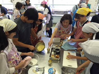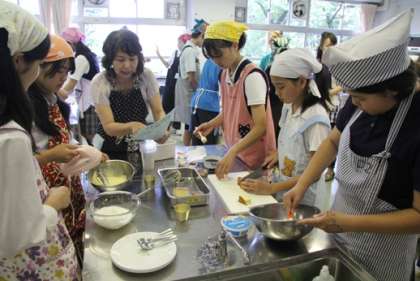 7月15日(水)1学期最後の「放課後の料理教室」が開かれました。料理教室は毎月1回開かれますが、土曜日の時は昼食メニュー、水曜日の時はスウィーツをつくります。特に、女子に人気のあるのはやはりスウィーツのときです。(最近は男子も多くなってきました)今回は30名の参加者があり、ティラミスとほうじ茶ラテを作りました。