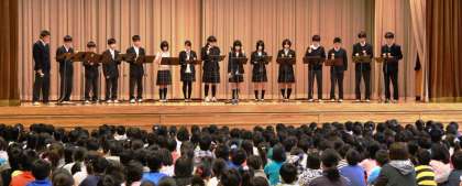 12月14日(月)毎年12月の1ヶ月限定で、生徒会中心の「桜丘中ハンドベル隊」が発足します。今日は、今年の演奏の皮切りです。お隣の桜丘小学校の朝会にお邪魔して、児童のみなさんに演奏を聴いていただきました。